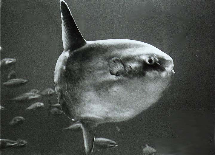 One of my early encounters with a mola was while collecting drifting kelp rafts in 1969 as part of my research at the Catalina Island School in Toyon Bay. I was leaning over the swim step of the K.V., our dive boat, pulling a large kelp raft into the boat for analysis. As I looked down in the water for the kelp holdfast, I saw what I thought was a shark coming up at me. I should add that I was not wearing my glasses (they'd do little good at 400 feet if they fell off). The "shark" turned and I realized it was an ocean sunfish coming up to check me out.