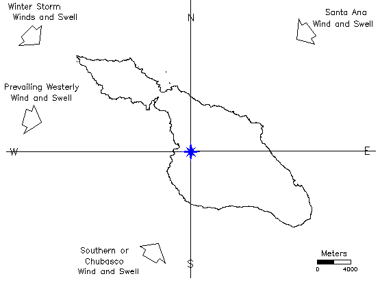 Figure 2: Santa Catalina Island is oriented in a NW-to-SE direction relative to the prevailing westerly and northwesterly winds and swell which directly impact its southwest-facing windward side. Occasional summer chubasco storms strike this coast from the south to southwest. The more protected leeward coast may also be impacted by seasonal Santa Ana storms.